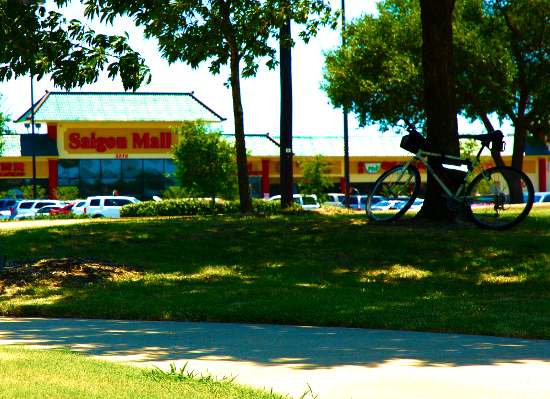 The south/east terminus of the Duck Creek trail is at busy Jupiter Road, with the Saigon Mall across the street. I love this place. Sometimes, when I have the time, I ride my bike over to Lee’s Sandwiches and buy their fresh baguettes. I have to ride how with the long, thin, loaves sticking up out of my backpack. I feel like a Frenchman.