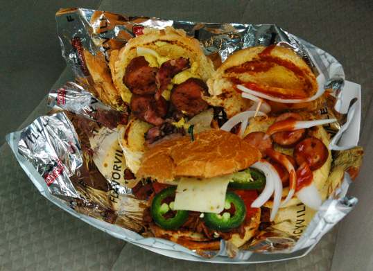 The folks that brought us Gandolfo’s have a sister truck out, The Butcher’s Son. It is in cahoots with a sausage company and offers a selections of meaty treats. Two trucks were perched out in a busy parking lot not too far from our house.