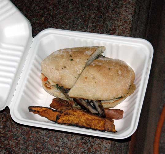 The Green House is known for healthy food. Looking over the menu, I chose a Portobello Mushroom sandwich on Ciabatta bread with walnut/basil pesto, grilled vegetables, and a side order of sweet potato fries.