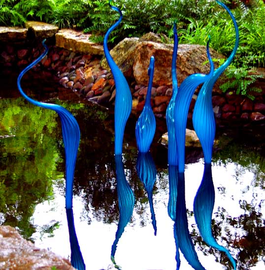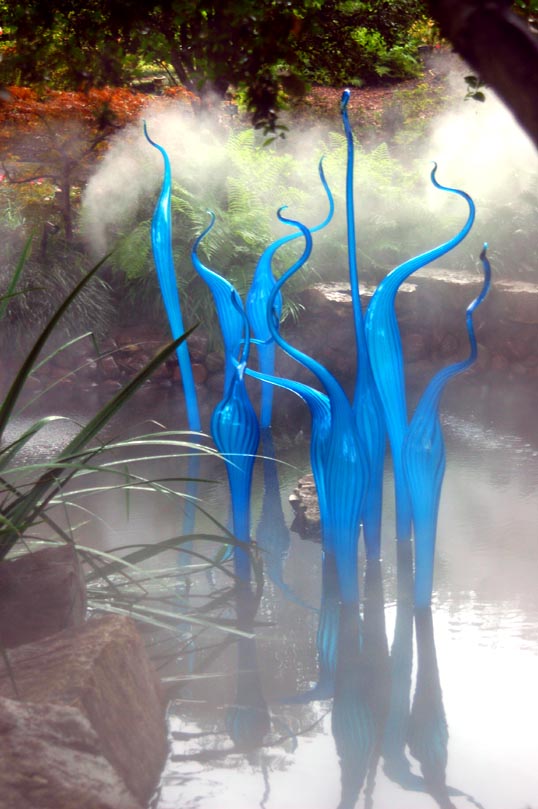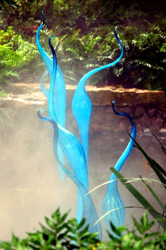 One group was some gorgeous blue glass that was set in the waters of the Palmer Fern Dell near the entrance to the Arboretum. This is a cool, shady spot that is a great escape from the killer Texas summer sun. The ferns are misted periodically from an automated system set on a timer and the rising fog gives the dell an otherworldly aura.