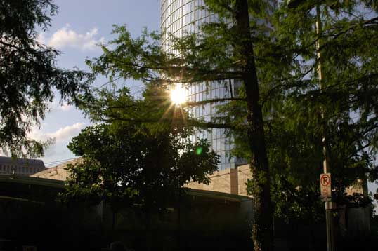 I found a nice shady spot under the cypress trees along Flora and then I was struck by the solar death ray beamed down from the Museum Tower. I swear that thing raises the temperature ten degrees.