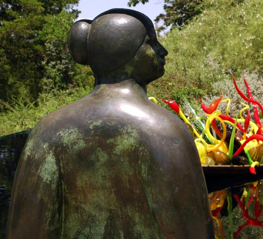 A sculpture, The Neighbor, by Joe Rosenthal in A Woman’s Garden in the Dallas Arboretum. A bit of Chihuly is visible floating in the infinity pool beyond.