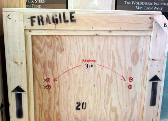 In a hallway in the New Orleans Museum of Art I saw a pile of wooden crates. Obviously a new exhibit on its way in – the plywood was stenciled with a set of transportation-related symbols.