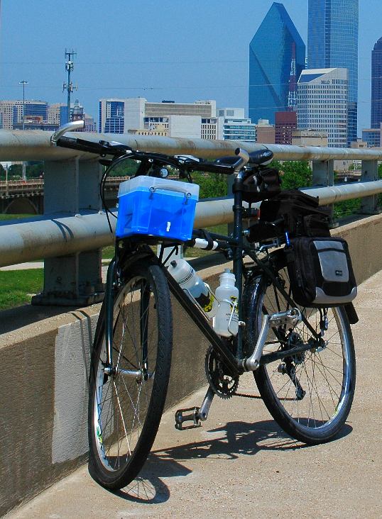 I’ve been experimenting with mounting crap on the front and rear racks. I bought a used bag at a swap meet that works on either one – it holds my camera well. For a while, I’ve had some panniers and a cooler that I can carry cold water in – that helps get me through the summer. I have this nice little plastic box I bought at Staples and mount on the front with nylon wingnuts – it looks awful (it’s this bright translucent blue – I’ll go by there and get a grey one soon) but is handy to throw in last minute stuff – phone, lock, whatever.