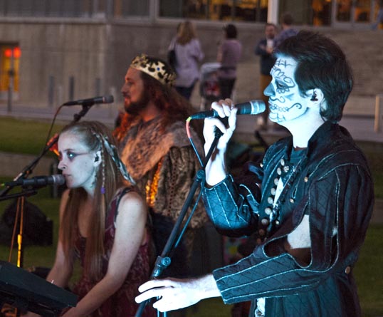 In Halloween style, they were in costume, as were more than a few of the folks present. By the end of the concert, there was a clot of folks decked out in bizarre outfits dancing along the edge of the reflecting pool (sorry, no photos – it was too dark by then). Pretty surreal and a lot of fun.