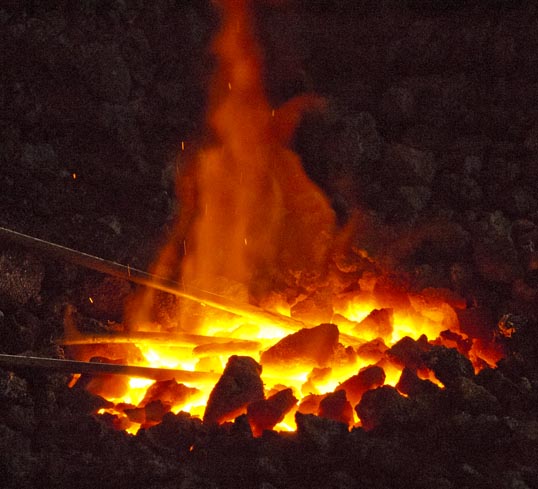 Blacksmith fire from coal and coke. You can see a knot heating in the lower left.
