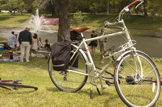It was a beautiful spot – along Turtle Creek with a fountain in the center and a wave of purple/pink Azaleas blooming across the water. We parked the bikes, spread out the blankets, and unloaded the vittles – a veritable moveable feast. A volunteer had driven in to deliver items too bulky to bike – coolers of ice, extra water, a croquet set. Not content with pitiful portable picnic players, he brought in a generator, amp, and speakers and we had vintage music all proper – angel trumpets and devil trombones.