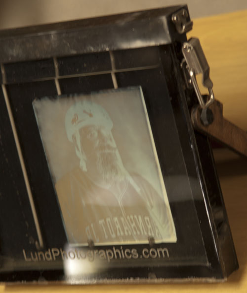We were there early enough to be able to talk about the process before the crowd became too thick (though I’m guessing here about the exact chemicals used). They start out with a small aluminum plate and coat it with a collodion (basically gun cotton dissolved in ether – not too safe) solution and silver nitrate. That is exposed with a bright light in a camera.