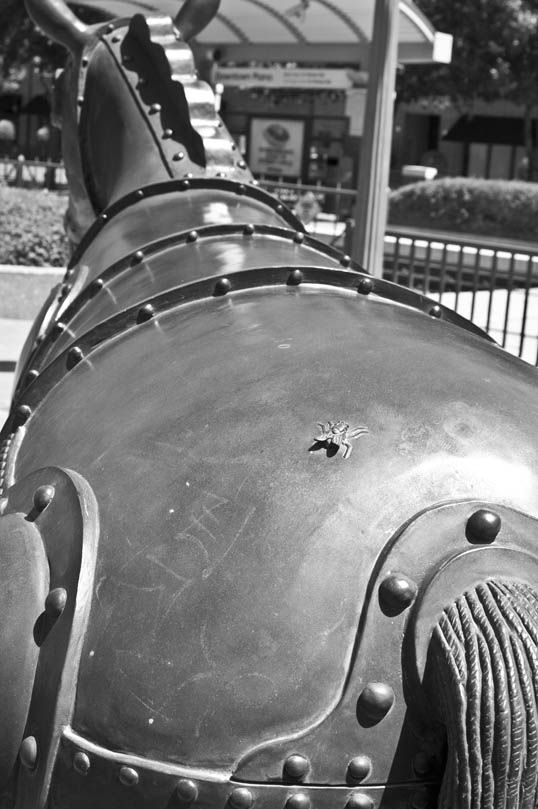 Today, waiting for a train at the downtown Plano DART station I took a look at a cool little horse sculpture – sort of a steampunk steed. I was impressed to find that it too was being harassed by flies – two of them, as a matter of fact.
