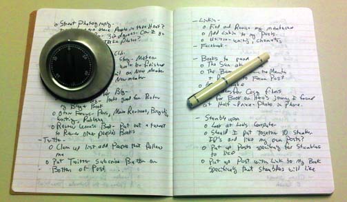 My Pomodoro timer, Moleskine, and Ivory Pilot Prera fountain pen.