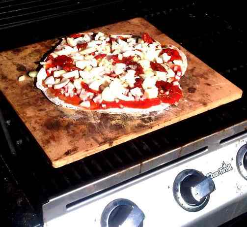When the weather is so awful hot, I like to cook pizza on a stone on our grill outside. Here’s the crust on a pizza peel and the stone, warming up.