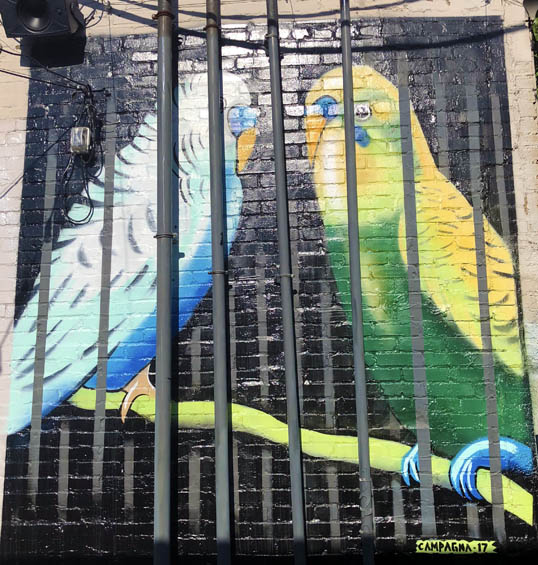 The other weekend, riding scooters around Deep Ellum, I saw this relatively new mural done by Frank Campagna. I liked how it used the vertical pipes as 3D cage bars.