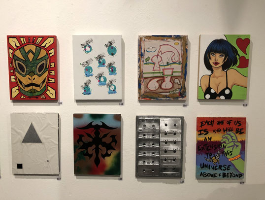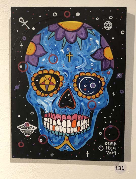 Happy with my choice, I wandered around looking at all the art, writing down the numbers of about two dozen works that I particularly liked. Then I joined the long line waiting for a painting. When I reached the front, I was surprised at how man numbers I had written down were still available. I chose a colorful Day of the Dead skull that I knew Candy would like.