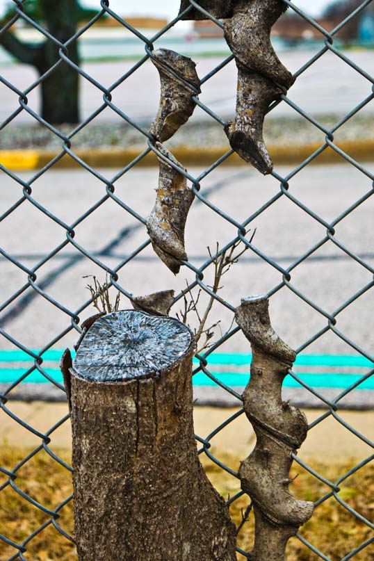The campus where I work is surrounded by a wire-mesh fence. I had been ignored for decades and was, in many places, covered with various vines that had grown up and expanded until the wire was covered with green.