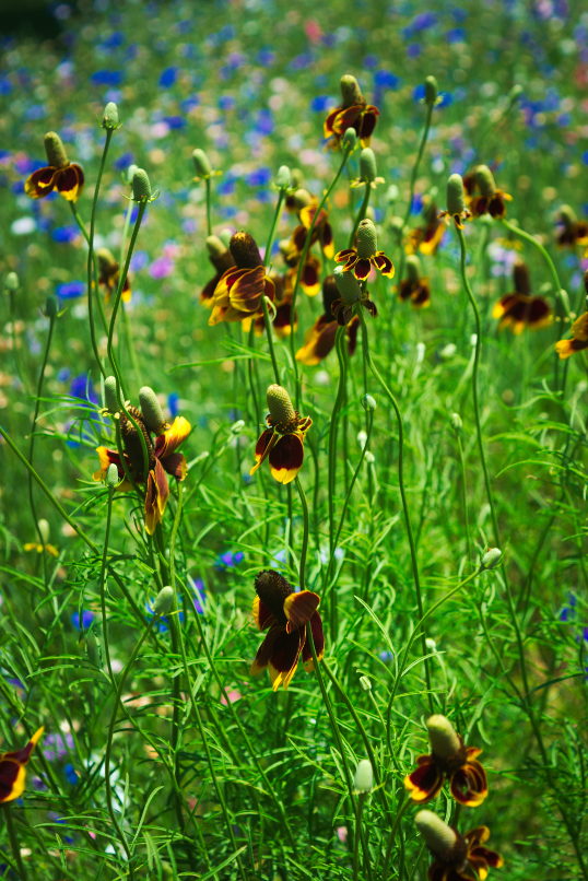The City allows patches, often in vegetated medians or along the borders of parks, to grow unattended, unmowed, into patches of wildflowers. I stopped along one such patch on my bike ride and took a few photos. Mostly the ubiquitous Texas Bluebonnets, but also other, similar, wildflowers of various colors. On this patch there was a singular clump of these which stood out and above the others. I have no idea what these are (Black Eye’d Susans?) but they drew the eye. And the camera.