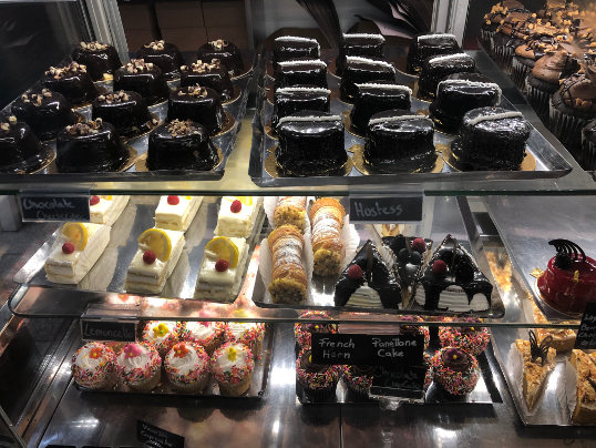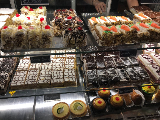 These photos are of the cases in Modern Pastry, in Boston’s North End. We bought Napoleons and Carrot Cakes – both visible in the second photo. We ate them walking in the street – which isn’t ideal.