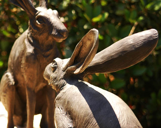 I’m not sure why she did this, but as the dogs ran by she reached out and flipped on the light switch for the back yard (I mean… the dogs can pee in the dark, can’t they?) and there, right in the middle of the yard, illuminated by a circle of spotlights, sat a rabbit.
