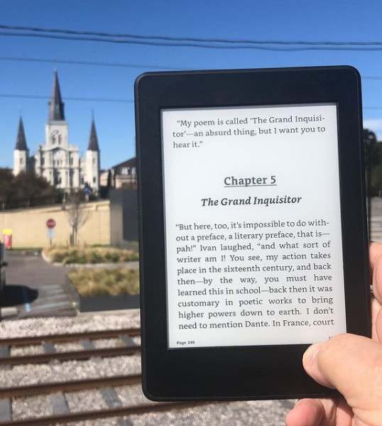 It was a beautiful day. I took my Kindle, walked down through the French Quarter and picked out a bench along the Mississippi to sit down and work my way through the (e-ink) pages.