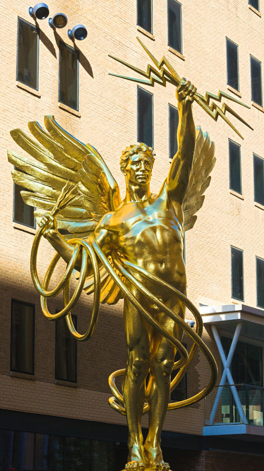 Commissioned for 195 Broadway in New York City. the sculpture has followed AT&T to other sites in New York and New Jersey over the years. In 2009, the statue was relocated to AT&T’s current corporate headquarters in downtown Dallas, Texas, U.S. As of 2022, the statue is located outside in the AT&T Discovery District in Downtown Dallas.