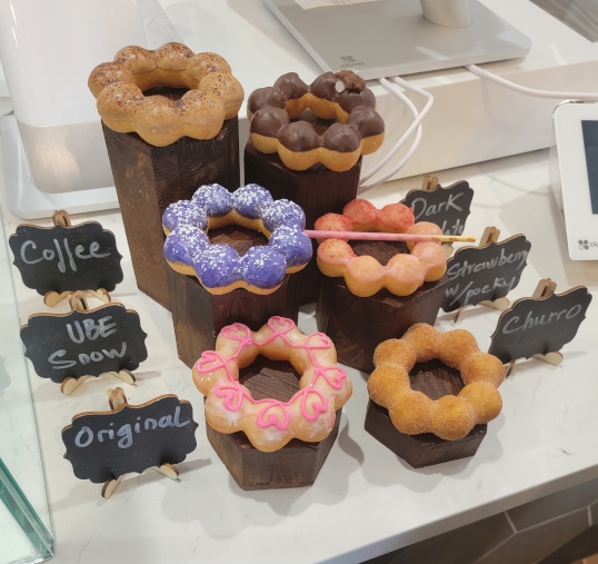 The other day I wrote about having to drive between two donut stores on the way to work every day. Due to medical conditions I can’t eat donuts… not even one. I’m used to that, but still I can dream. I am especially interested in the one on the south – a new Japanese fusion donut shop called Mochinut. The donuts look like a circular string of donut holes and are made with rice flour. Best of all, they come in tantalizingly oddly different flavors.