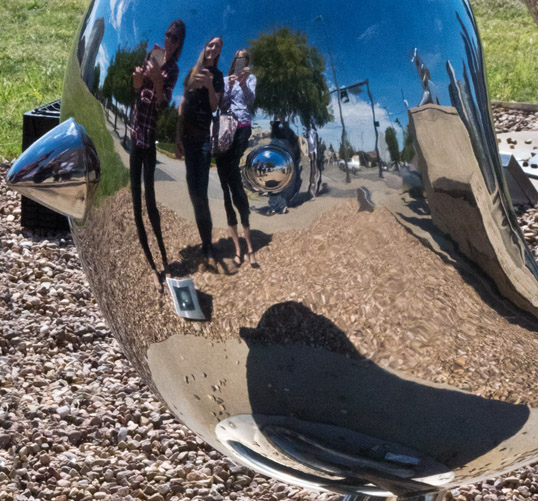 Tourists reflected in a metal bird. Travelling Man Sculpture, Deep Ellum, Dallas, Texas