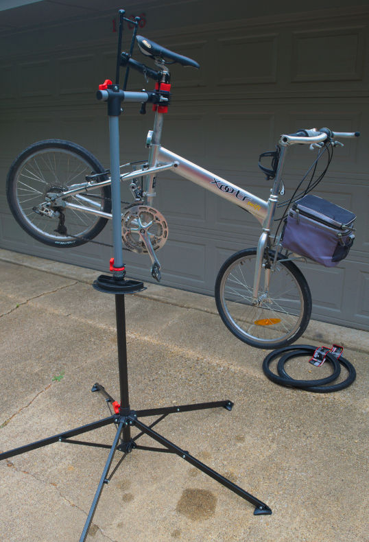 My Xootr Swift folding bike in the repair stand from Aldi