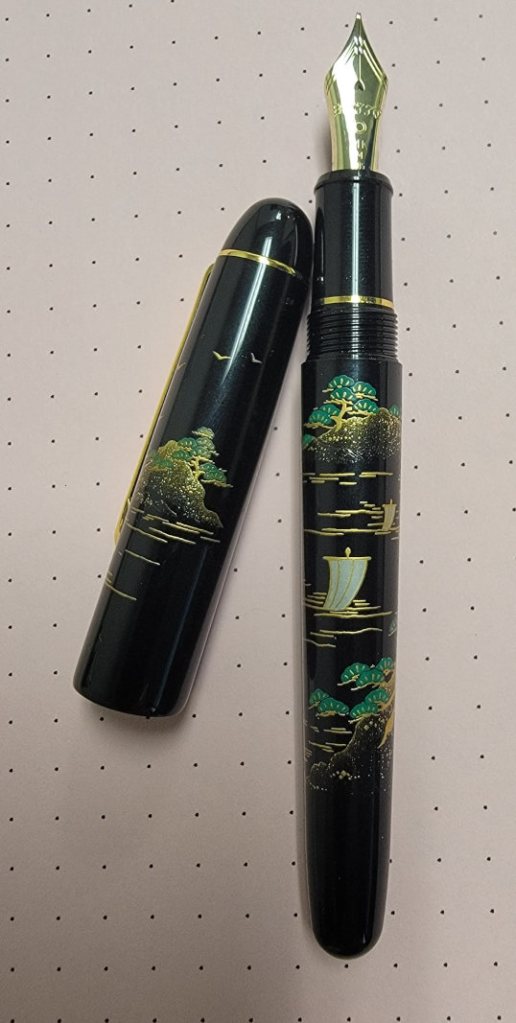 The Urushi lacquer and Maki-e artwork is stunning (it is the modern “screened” Maki-e instead of hand drawn – but I don’t care). It is the Sansui design of boats, rocks, and flowering plants… with some cool gold birds flying across the top and, best of all, a gorgeous blood-red rising sun peeking out from the clip. The nib is a big #5 14K gold, with a simple design and a stylized Mount Fuji straddling the tines (the reason the pen is called #3776 is that is the height of Mount Fuji in meters). I never really thought about a pen like that – I never would be able to spend that kind of money to myself. I’ve inked it up with some Pilot Iroshizuku Kon-Peki blue ink and can’t keep my hands off it.
