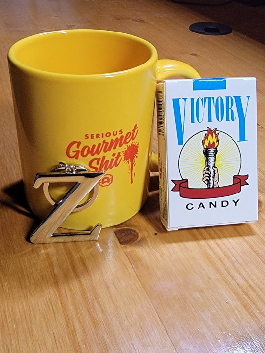 Coolest of all, everyone received some swag – A Serious Gourmet Shit coffee mug, a pack of candy cigarettes, and a Zed Keychain (Zed’s Dead, baby). Now I have a place to keep my chopper keys.