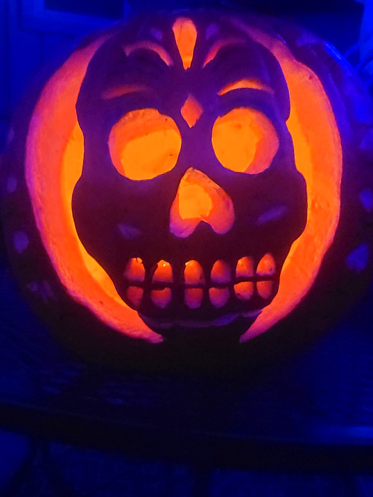 My son Lee came over to visit last Saturday – to hang out and watch Tulane win a football game (both his school, Tulane, and mine, Kansas are 3-0 on the season – which doesn’t happen very often). He brought a pumpkin and, although Halloween is still a bit off he carved it up into a skull. Candy loves skulls. He still has his artistic talent.
