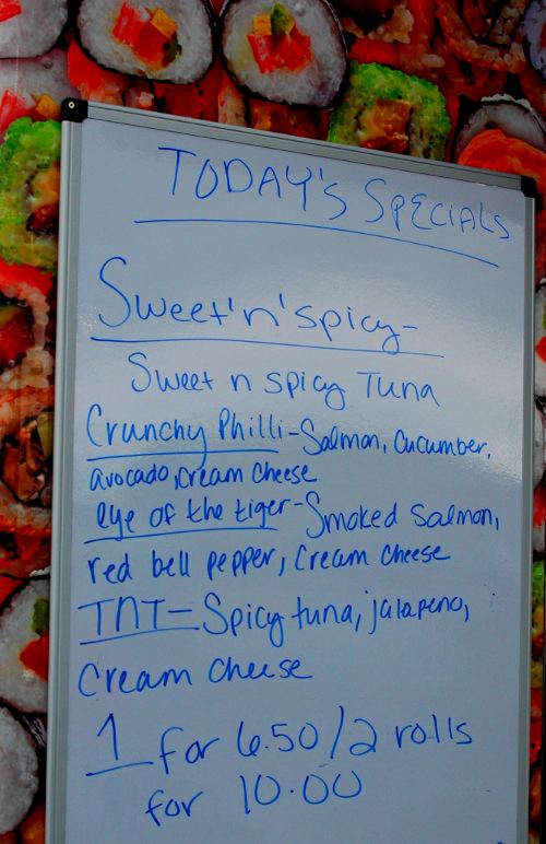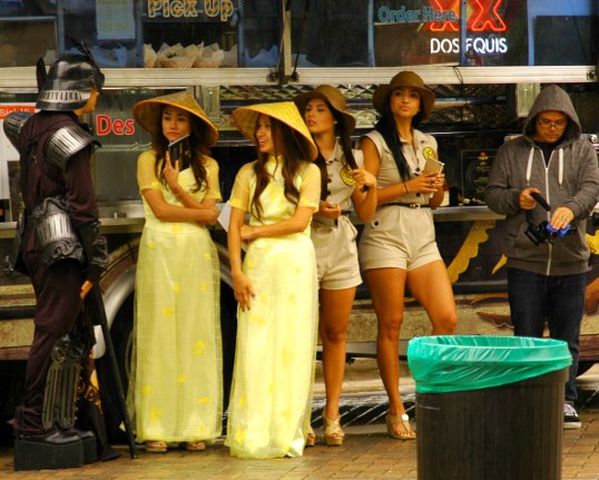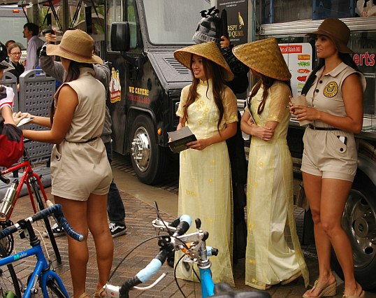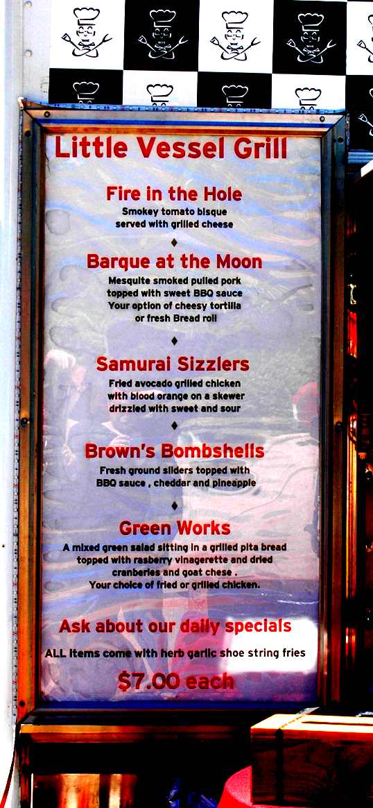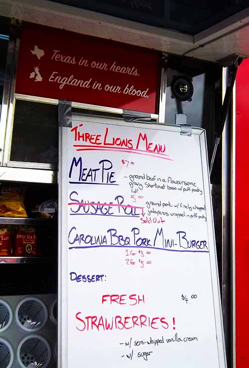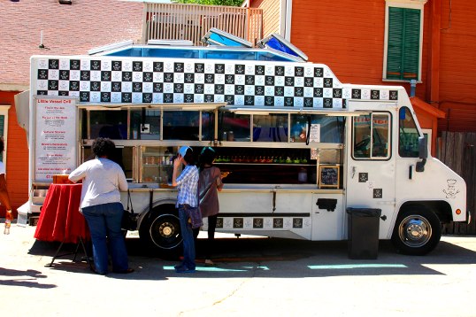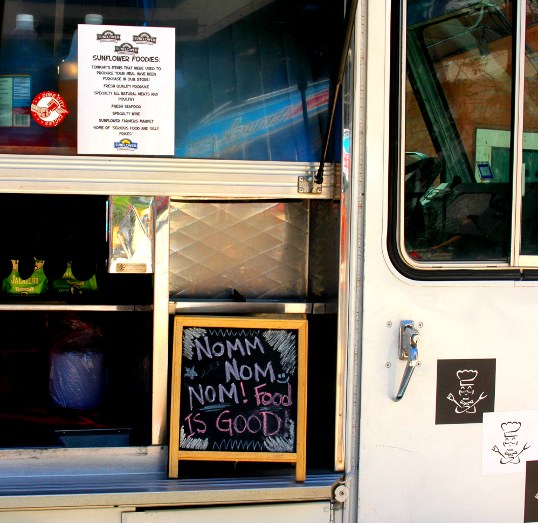 I didn’t think of an umbrella and by the time I walked up to the truck I was drenched and probably looked like an idiot. Four women and one guy in costumes were huddled outside the truck when I walked up and said, “Can I have a silkworm sandwich?”