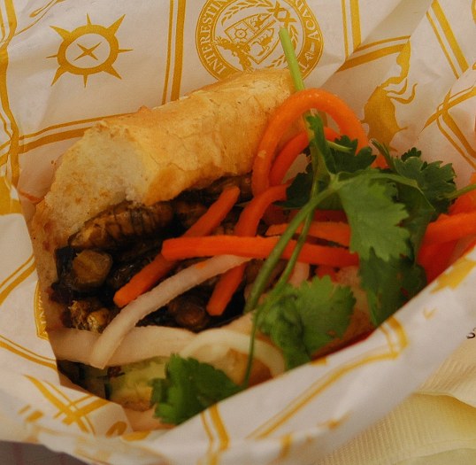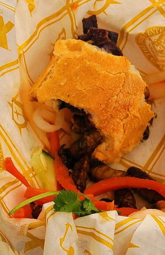 While I was eating a couple walked up to me. We talked about the various other food trucks lined up. They did a good job of holding a normal conversation with a stranger that was shoveling insect pupae into his mouth. The guy had been to Vietnam and talked about the sandwiches and how they weren’t really sure about what was in them, but they were good.
