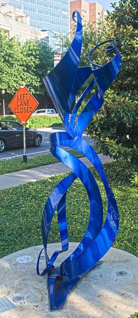 I decided to ride up to CityLine, about a five mile ride from my house. It’s a huge new development in the long-vacant space of the old Huffhines family farm. At first I was a bit disappointed in the development but as it has matured and mellowed out I am beginning to really like the place. There are sculptures of all sizes and styles scattered throughout – I sat near this one and enjoyed a water bottle before riding back home.