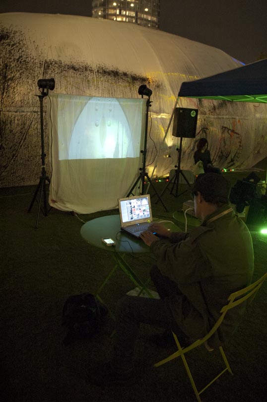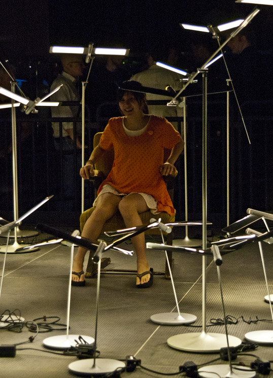Inside the theater they had the screen up and running. People walking, riding bikes, or pushing carts moved across the screen in a ghostly crowd. Behind the screen a jazz trio performed retro music – a beautiful contrast to the high-tech images they were immersed in.