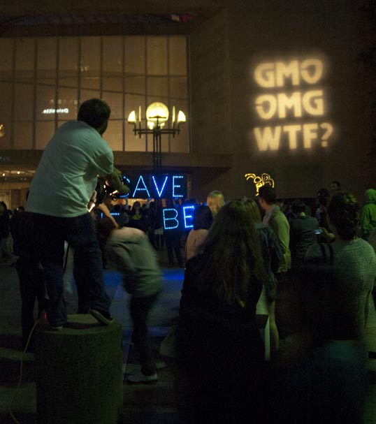 Next, I wanted to see the Wyly Theater. I had seen a preview and knew I had to check out the real thing. Several banks of incredibly powerful video projectors were trained on the wall of the Borg Cube – shaped Wyly. The genius is that the program started with an image of the Wyly projected on itself, which then was moved, shifted, deconstructed, and modified until the thing was transformed into a giant 2001-style cube monolith – “It’s full of Stars.”