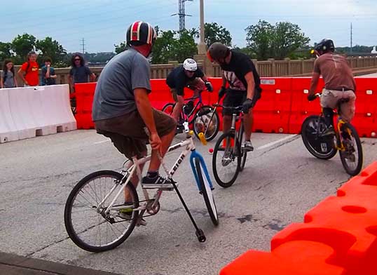 The good folks at Bike Friendly Oak Cliff had organized this event and the City of Dallas had closed off the Houston Street Viaduct to cars. The viaduct is a long bridge that reaches out of the skyscrapers of downtown over to Oak Cliff across the vast Trinity River Bottoms. Over the decades I’ve lived in Dallas I have driven across the Houston Street Viaduct many times and I knew it would be a dramatic place to hang out and ride a bike because of the view of downtown and the long drop down into the river.