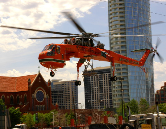 I rode the DART train into Downtown Dallas for the last Dallas Writing Marathon and as the short line of yellow electric cars climbed out of the tunnel under Central Expressway I could hear a distinct WUP-WUP-WUP sound. Looking out the window, I saw a gigantic lifting helicopter delivering a load to the top of the Chase Tower (the skyscraper with a big hole in it). By the time the train pulled into the station, it had already settled into a parking lot behind the Plaza of the Americas.