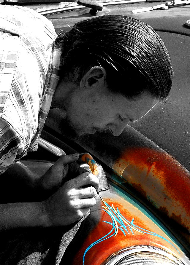 To watch someone do something like this is like watching someone doing magic – real magic. I can’t imagine having the eye, the dexterity, most of all the ability to shut everything out of mind other than the brush, the fender, and the paint. Notice how he has the two colors of paint he is using in daubs on his index finger – he picks up what he needs and brushes it in place. It is completely freehand – no masking tape, no guide lines, not even a design done ahead of time.