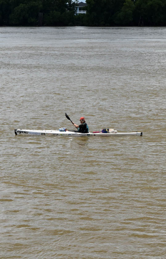 A while back, on my trip to New Orleans, my son Lee and I were in Crescent Park, hanging out for a few minutes, looking at the giant muddy expanse of the Mississippi River and the ships, tugs, and barges cruising past. A guy in an open-water kayak paddled by, going downstream, and I snapped a photo, wishing I had my longer lens. Other than the familiar automatic action of raising my camera and pushing the shutter, I didn’t think any more about it.