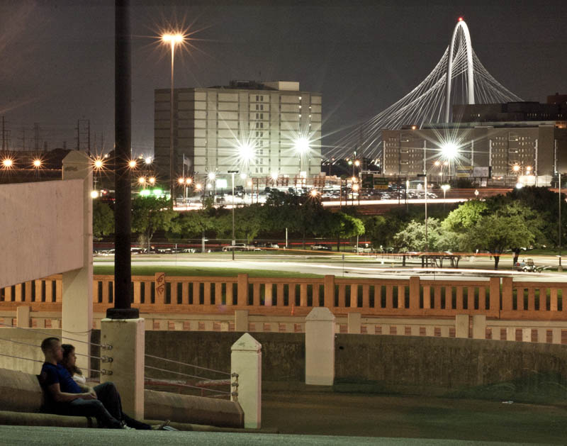 A group of friends in front of the Dallas Museum of Art, night, long exposure