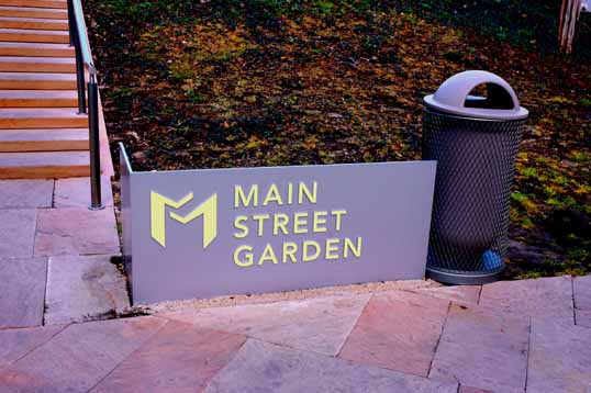 The main lawn of the Main Street Garden Park, with the permanent stage at the far end. The signs say, “Please Keep Off The Grass – We Are Growing Our Roots.”