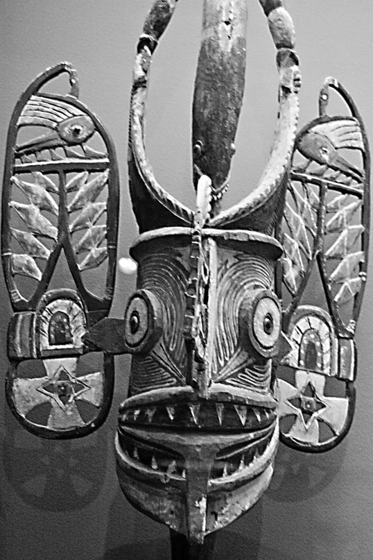 Pig mouth masks are associated with a distinctive fertility ritual called porka, which encourages increase and abundance among human beings, animals, and vegetation. The bird mask shown here was used in a war dance that was performed by men and portrayed headhunting.