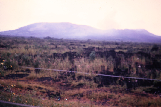 A blurry photo (taken from a moving vehicle) of the low Masaya volcano complex taken from the highway several miles away. It shows the rugged lava plain that had to be crossed to get there.