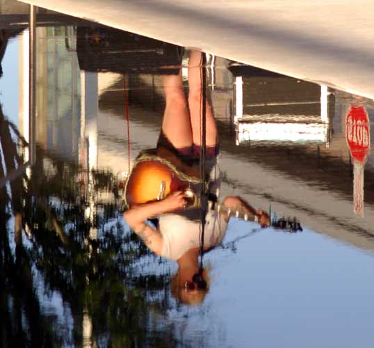 I had brought my fabric briefcase. It has my Alphasmart in it – along with the digital camera and some other stuff – in case the muse strikes unexpectedly. I pulled a couple pieces of paper out and punched a pen through one, trying to make a crude pinhole camera so Lee could watch the progress of the moon’s shadow. It was too late in the day, though, the angle too severe, and I couldn’t get it to work very well.