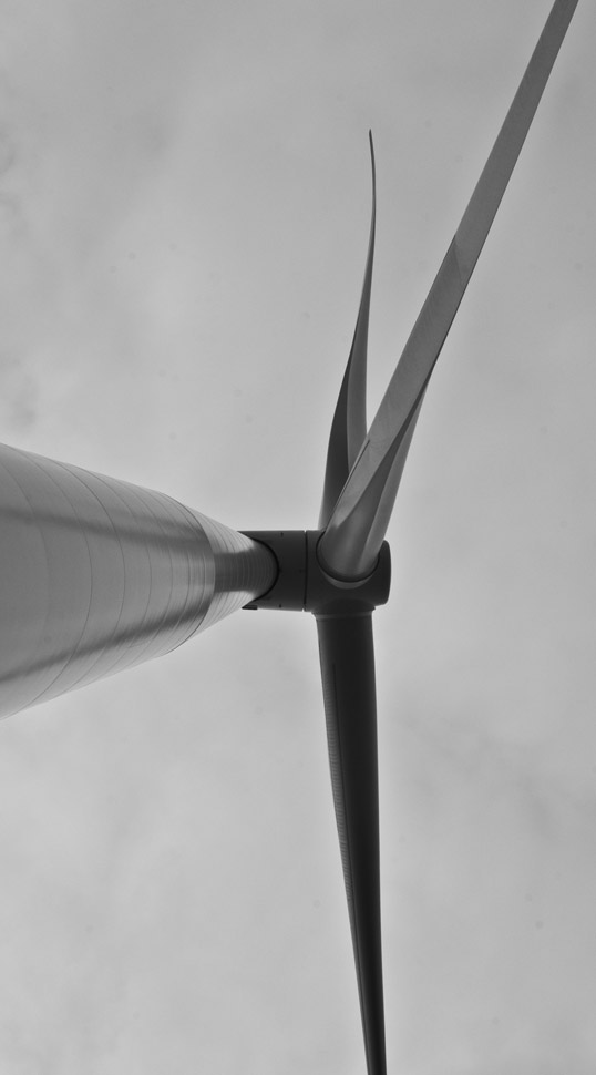 The first thing that strikes you about the turbines in a wind farm is the sheer size. Since they are hoisted up above a featureless, flat plain – they are visible for miles away and it took more driving than I anticipated – down sliding sand roads to reach them. I was surprised that there were no fences, gates or other security and that I was able to move right up to the base of the massive towers. Then, looking up is a giddy, vertiginous adventure. The size of the tower and the surprising speed of the blades is intimidating and unnerving – like looking up into an unexpected, impossible abyss.