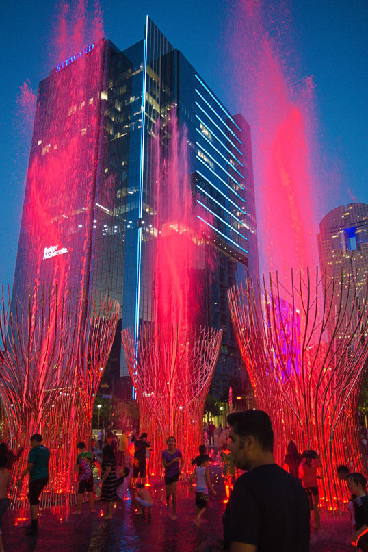 By day, the Fountain is an interactive play area for families and a relaxing respite in the heart of Dallas. It features a 5,000-square-foot splash pad, which can accommodate hundreds of children at a time.