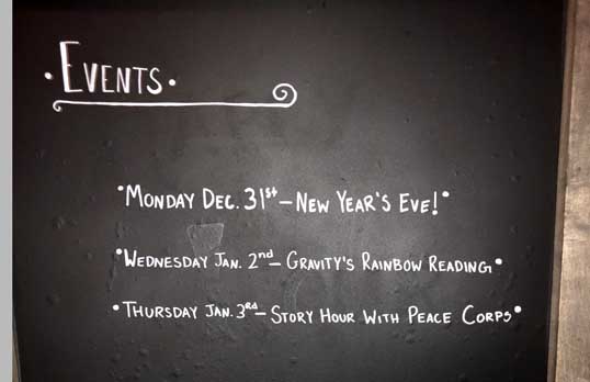 It started with Gravity’s Rainbow. I saw this sign, a couple of years ago, at The Wild Detectives bookstore in Bishop Arts. We met there (a bit of a trip for me) every Wednesday evening for several months as we slogged through the difficult, but fantastic, book together.