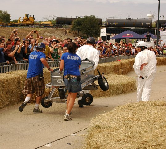 One of the first entries was “Three Men in a Tub” – and they picked up some serious speed until a weld gave way and they had a spectacular crash. The crowd was so tight I could only see the bit of race right in front of me – but there were big video screens set up and they replaced the tumbling high speed wreck over and over. Post-disaster the racers walked by me lugging their wrecked vehicle (helped by track employees) and one guy had a terrible road rash and he seemed in pain from knocking his helmeted head into the pavement.
