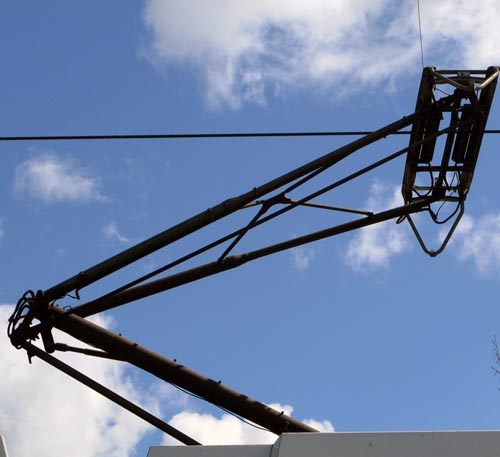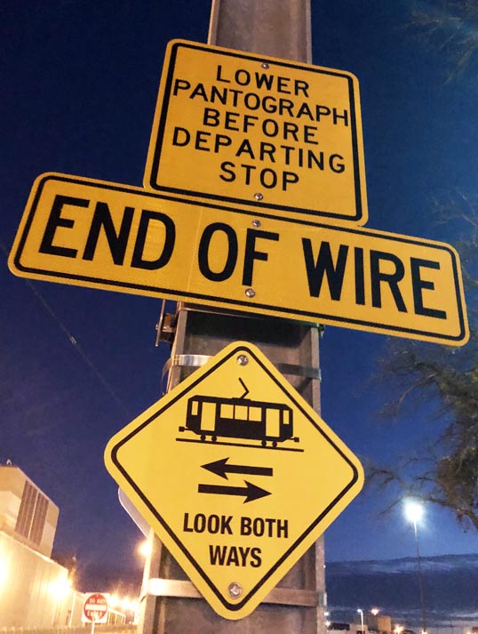Well, the Dallas Streetcar has one unique property. One mile of its journey is across the Houston Viaduct, which has a historical designation. That means they could not install poles and overhead wires along that stretch of track. The streetcar uses internal batteries for that stretch, charging them with overhead wires the rest of the journey. Therefore, the “Lower Pantograph Before Leaving Stop” and “End Of Wire” warning signs to remind the operator that the vehicle was about have to go on battery power.